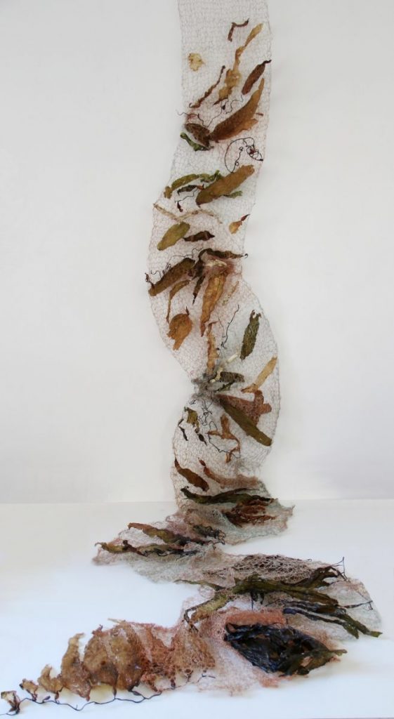 Silvia Roldán y Lilia Breyter han recorrido un largo camino de experimentación a través de materiales y amalgamas diferentes con técnicas tradicionales y una mirada contemporánea. Trabajan tanto la lana y la seda como el papel y los metales subvirtiendo la correlación entre significante y significado. En sus esculturas textiles el vacío se llena de sugerencias, el papel deviene en material de lujo, su blandura se mimetiza en las formas de la piedra y el metal se torna dúctil y maleable en diálogo con la seda. Botones cosidos con amorosa fruición evocan las tareas hogareñas de las mujeres de una época transformándose en gemas que adornan un peto que llevará otra mujer.
