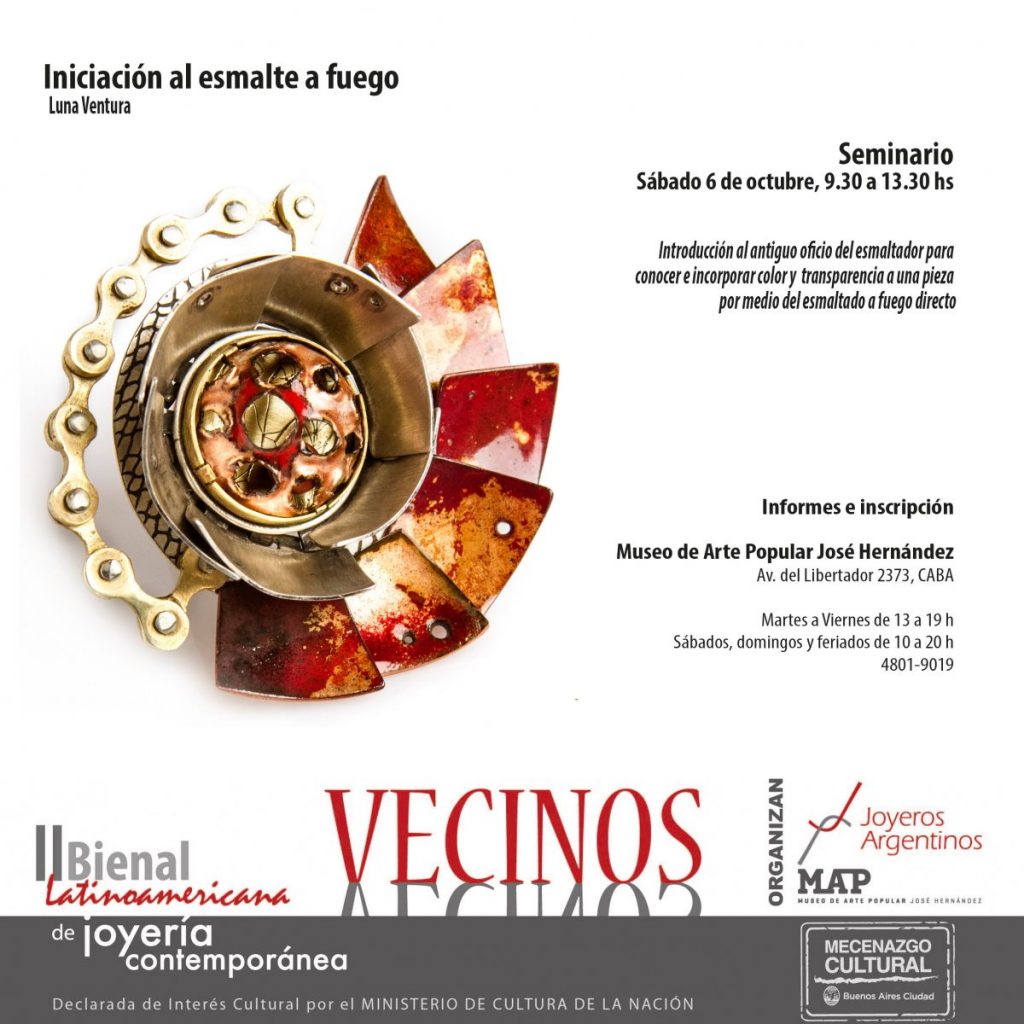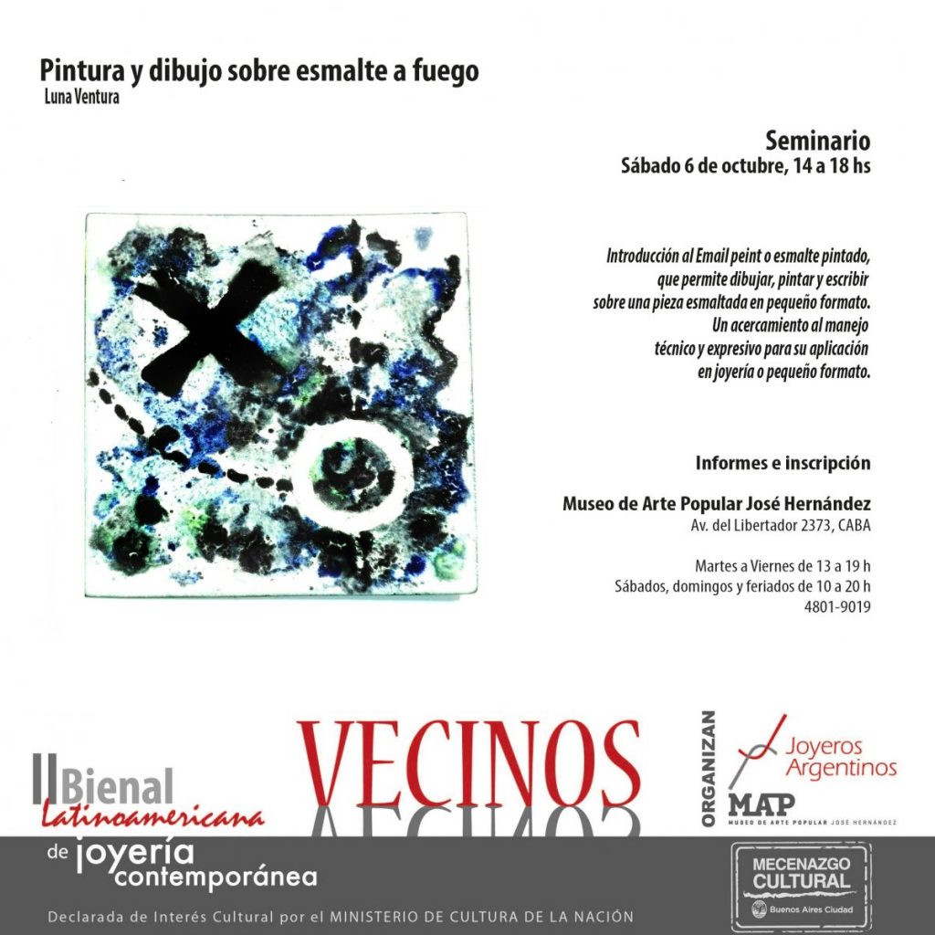 En el marco de la II Bienal Latinoamericana de Joyería Contemporánea, Luna Ventura brindará dos seminarios de esmalte: Iniciación al esmalte a fuego, y Pintura y dibujo sobre esmalte a fuego.