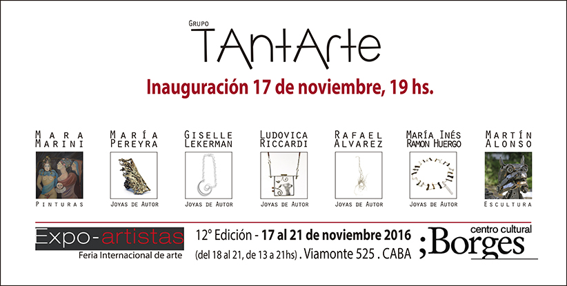 Del 17 al 21 de noviembre en el Centro Cultural Borges se presentará TANTARTE, grupo de artistas formado por Mara Marini (pintura), Martin Alonso (escultura), María Pereyra, Giselle Lekerman, Ludovica Riccardi, Rafael Alvarez y María Inés Ramón Huergo (joyería de autor) en una exposición que inaugura en el marco de la Feria Internacional de arte Expo-artistas.